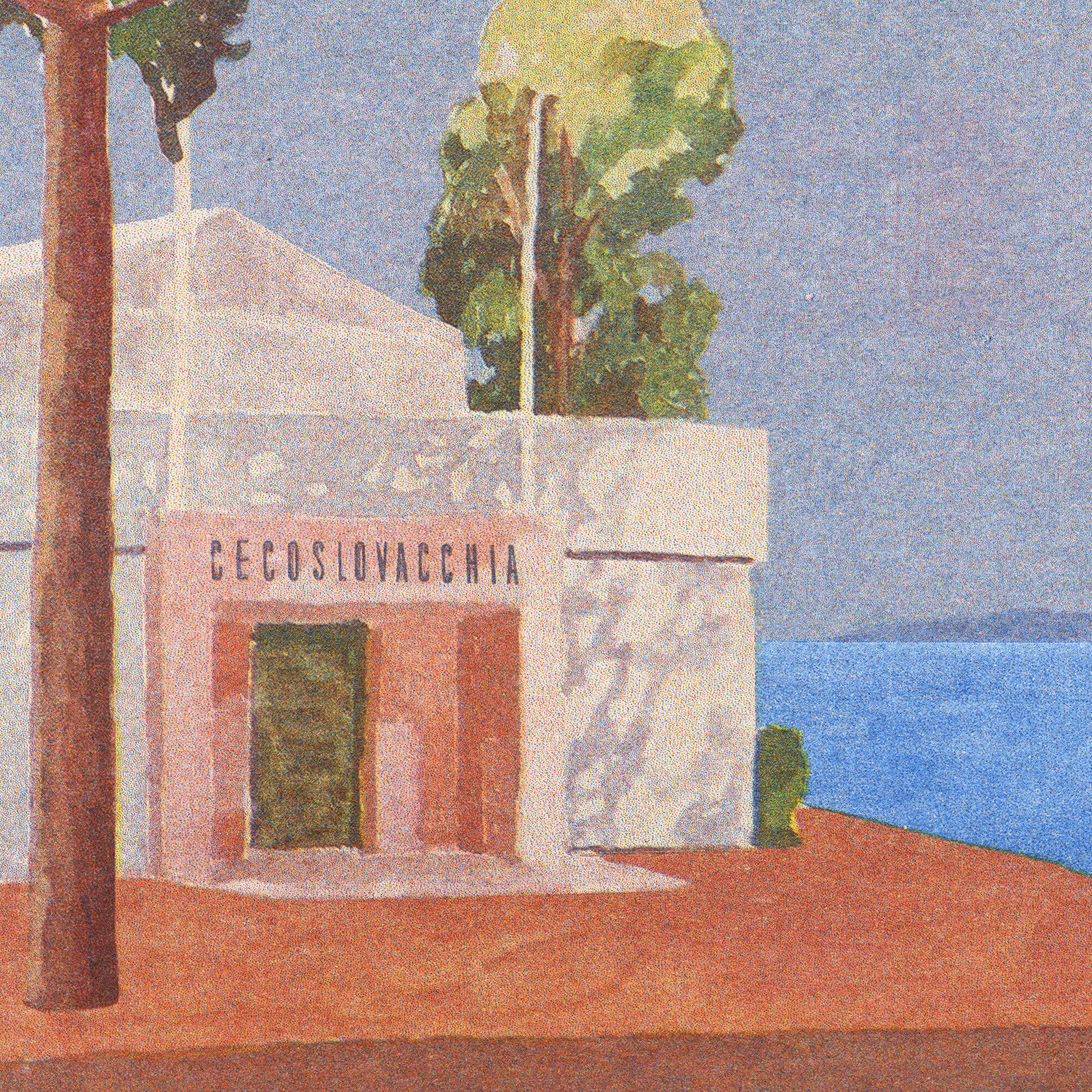 Benátske bienále je od konca 19. storočia prestížnou prehliadkou svetového umenia. Jednotlivé krajiny pripravujú preň pripravujú výstavy vo svojich národných pavilónoch, pričom ten československý navrhol ešte v roku 1926 Otakar Novotný, jeden z priekopníkov modernej architektúry. Odvtedy sa doň neinvestovalo. V roku 2019 naň počas búrky spadol strom a Česko ani Slovensko dlho nedokázali sprocesovať jeho opravu. V roku 2024 v exteriéri pavilónu vystavoval Oto Hudec so skupinovým projektom Floating Arboretum. Grafika nadväzuje na námet projektu o stromoch plaviacich sa do bezpečia.